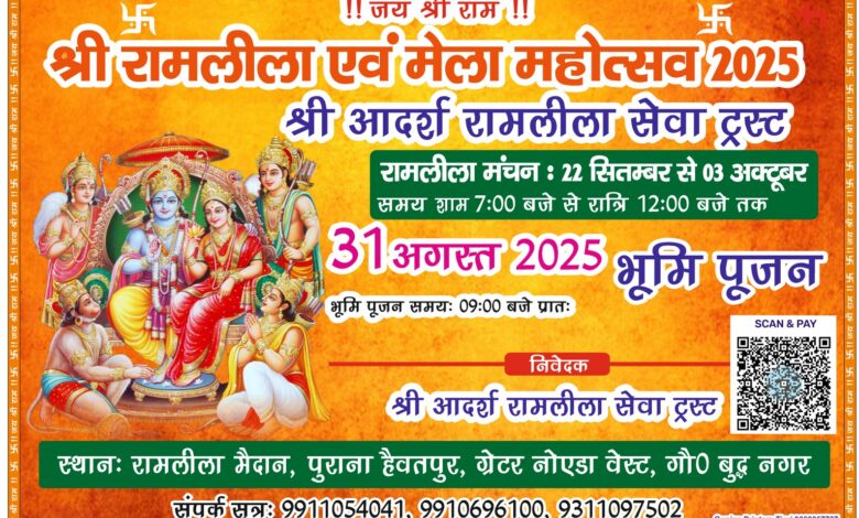 ग्रेटर नोएडा वेस्ट: श्री आदर्श रामलीला सेवा ट्रस्ट द्वारा इस वर्ष भव्य श्री रामलीला एवं मेला महोत्सव 2025 का आयोजन किया जा रहा है। इस महोत्सव की शुरुआत एक शुभ भूमि पूजन एवं हवन के साथ होगी।